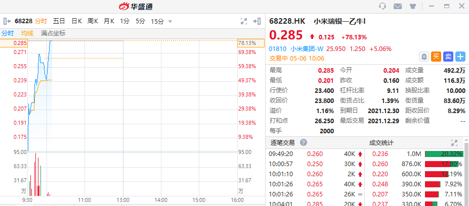 相关窝轮方面,小米瑞银一乙牛I大涨78.13%,成交额116.3万港元,其行使价为23.4港元,2021年12月30日到期,溢价1.16%。