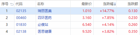 华盛资讯5月6日消息,港股医美板块延续涨势,截至发稿,瑞丽医美大涨14.77%,创历史新高,本周累计涨幅高达55%;四环医药涨7.85%,必瘦站涨4.14%,医思健康涨3.82%。
