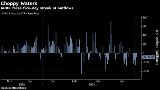 根据彭博数据,ARKK连续五天流出资金,总计近7.7亿美元。4月份,这个规模达210亿美元的基金出现月度资金净流出,是自2019年10月以来的首次。Ark Investment Management没有立即回应置评请求。