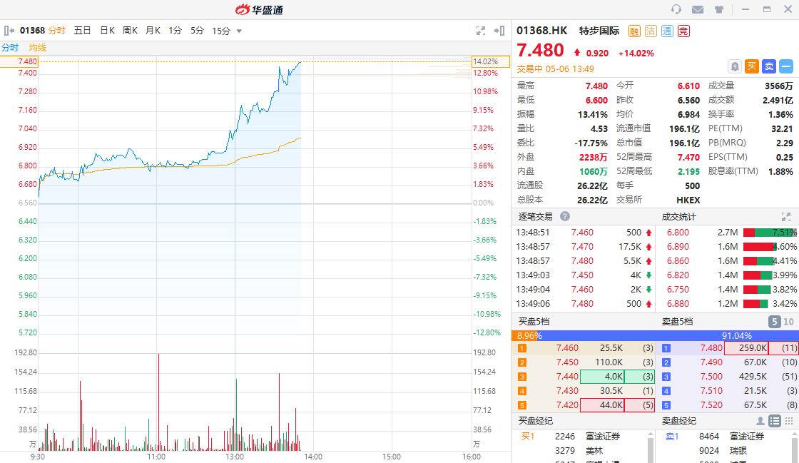 华盛资讯5月6日消息,特步国际午后迅速拉升14%,目前报7.48港元,突破历史新高。值得注意的是,该股三个月累计暴涨106%,今日成交额达2.491亿港元。