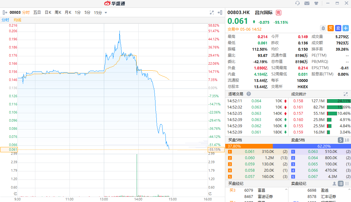 华盛资讯5月6日消息,昌兴国际盘中急速跳水大跌55%,现报0.061港元每股,换手率达39.26%。该股午后曾涨逾50%,日内振幅高达112.5%。