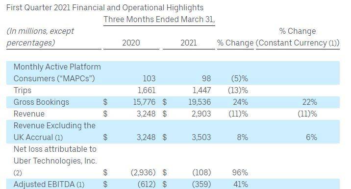 财报显示,今年一季度,Uber营收29亿美元,逊于市场预期的33亿美元,等于同比下跌逾11%。
