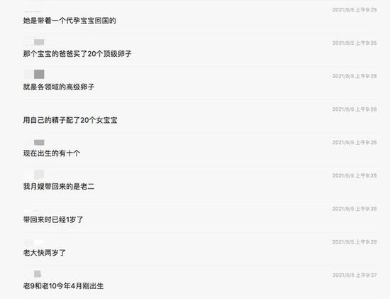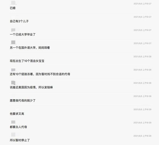爆料人还透露,目前已出生了10个混血女宝宝,“老大快两岁了,老九和老十今年四月刚出生,已带回8个孩子回国。还有10个胚胎冻着,因为暂时找不到合适的代母”。