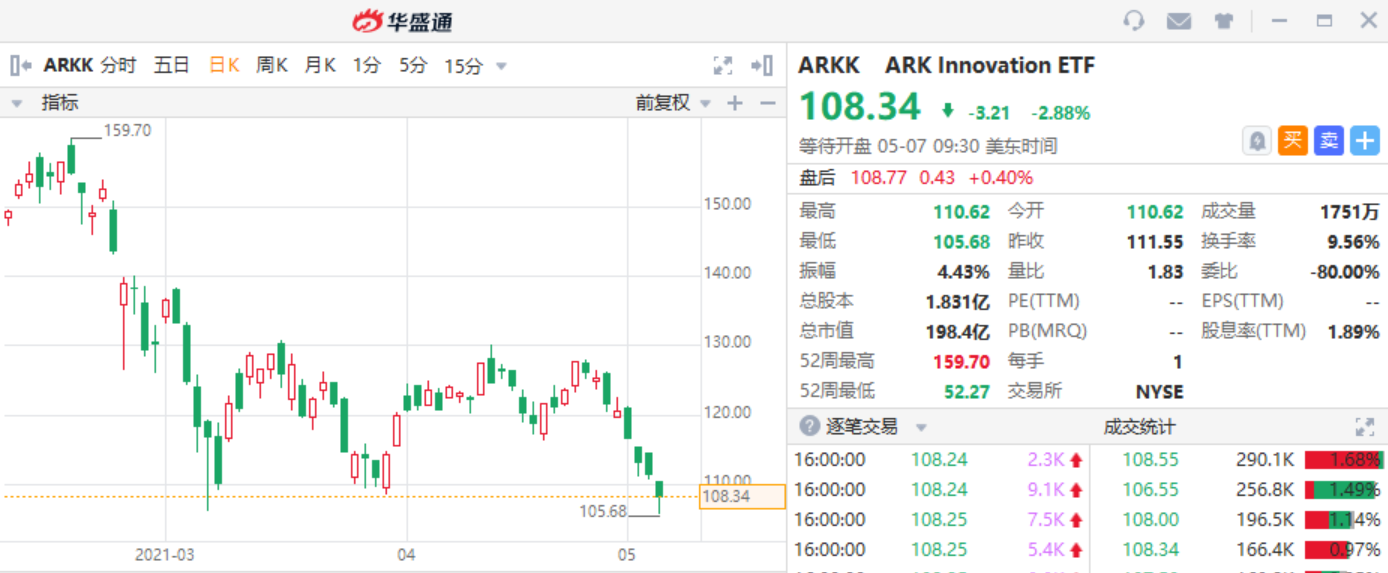 随着市场的投资配置从高增长、高倍数股票转向价值型和周期性股票,许多此类股票都出现了暴跌。尽管该ETF提供了对许多创新科技领域的投资,但这些领域更多偏向于伟大的长期押注,随着投资者的风险偏好降温,此前拥挤的交易热度出现逆转,ARKK的亮眼表现也变得更难以为继。