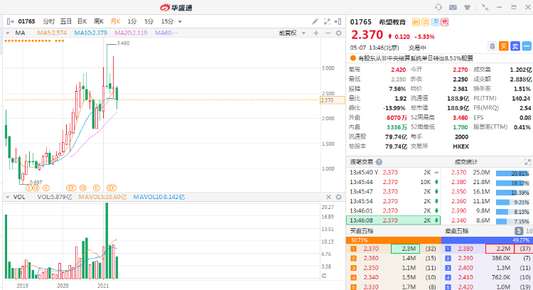 此前六个交易日累挫逾27%的希望教育(1765.HK)迎来反弹,现涨超5%,报2.37港元,总市值189亿港元。