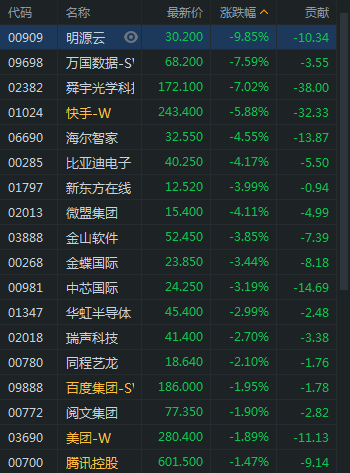 恒生科技跌幅扩大至2% 明源云跌近10%快手跌近6%