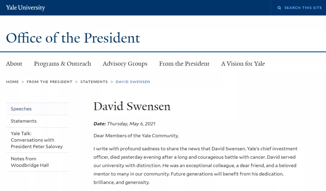 5月6日,耶鲁大学发布消息称,投资大师、耶鲁大学首席投资官大卫·斯文森于5日因癌症去世,享年67岁。