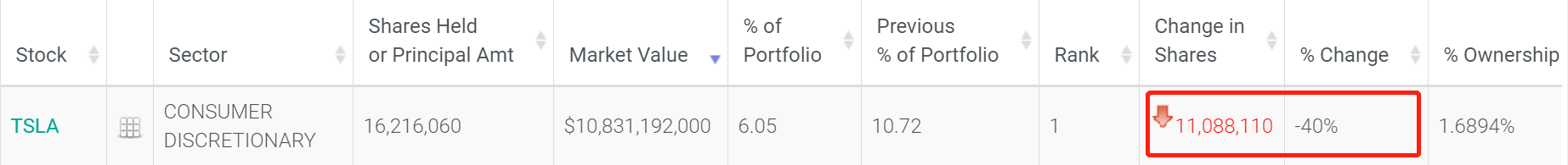 值得注意的是,一季度,该机构大幅减持特斯拉(TSLA)11,088,110股,环比减少了40%。但在前十大重仓股中,特斯拉仍位列第一,持仓约16,216,060股,持仓市值约108.31亿美元,占投资组合比重的6.05%,此前为10.72%。Baillie Gifford目前尚未就出售特斯拉股票的决定置评。