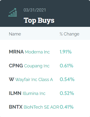 从持仓比例变化来看,前五大买入标的分别是:Moderna(MRNA)、Coupang Inc(CPNG)、Wayfair(W)、Illumina(ILMN)、BioNTech SE(BNTX)。
