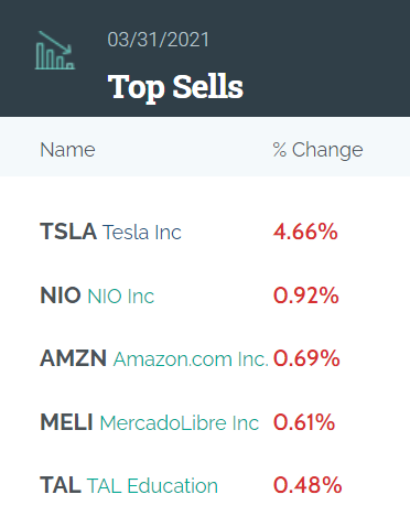 前五大卖出标的分别是:特斯拉(TSLA)、蔚来(NIO)、亚马逊(AMZN)、MercadoLibre(MELI)、好未来(TAL)。