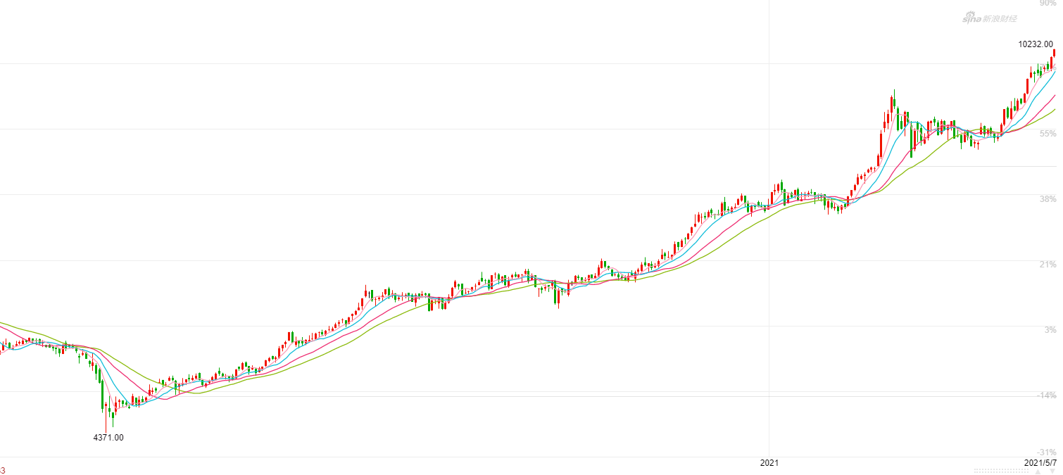 铜是最主要的工业金属,被广泛用于电气、建筑、机械制造、汽车制造等领域,因此铜价的表现往往反映了经济活动的真实情况。自疫情冲击探底之后,铜价的走势便一路向上,今日(5月7日)更是突破前高10190美元/吨,创出历史新高至10232美元/吨(截止发稿)。