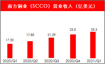 虽然产量略有下跌,但由于售价大幅提高,公司在2021年Q1营收也达到25.3亿美元,同比大幅增加47.3%。