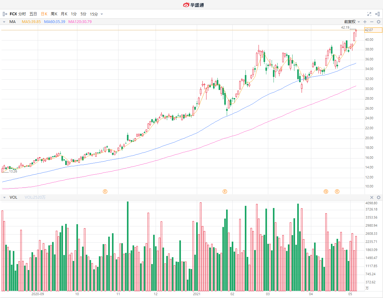 鉴于目前全球对铜需求的增长以及市场对铜价的追逐或得以维持,投行杰弗瑞的分析师LaFemina对自由港维持“买入”评级,并将目标价定为55美元,距离当前仍有30%的上涨空间。目前自由港股价同样创出近十年来的新高,涨势如虹。