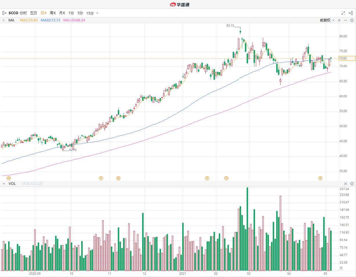 同样在美国上市的南方铜业公司是秘鲁最大的矿业公司,主要在南美洲各国开展采矿、勘探、冶炼等业务。截止5月6日收盘,公司股价72.82美元,市值560亿美元左右。公司2020年的产铜量也突破百万吨级别,成为全球第五大铜矿公司。