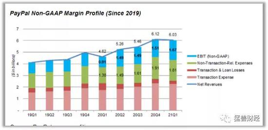 在2021年第一季度,PayPal的非公认会计准则息税前利润(Non-GAAP EBIT)环比增长了10.8%,而此前三个季度均保持在约15亿美元,并且同比增长了84%: