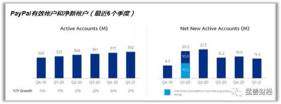 在2021年第一季度,PayPal的净新活跃用户增加了1450万,延续了PayPal自疫情开始以来每个季度新增新活跃用户约1500万的趋势(2020年第二季度为2130万),而在疫情前通常每个季度新增新活跃用户为1000万。在本季度的活跃账户也达了到3.92亿,同比增长了21%: