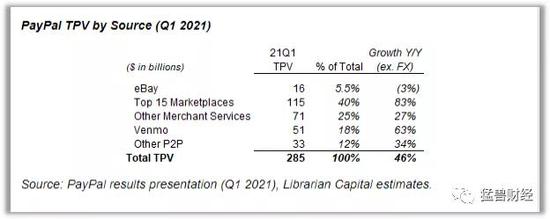 2021年第一季度PayPal的总支付额为2850亿美元,并且连续12个月超过了1万亿美元。根据管理层的评论,PayPal的总支付额按来源分类及其在2021年第一季度的增长率如下: