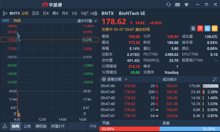 板块方面,抗疫概念股走强,BioNTech SE(BNTX.O)涨6.32%,Moderna(MRNA.O)涨3.12%,Inovio制药(INO.O)涨3.84%,辉瑞(PFE.N)涨0.84%。