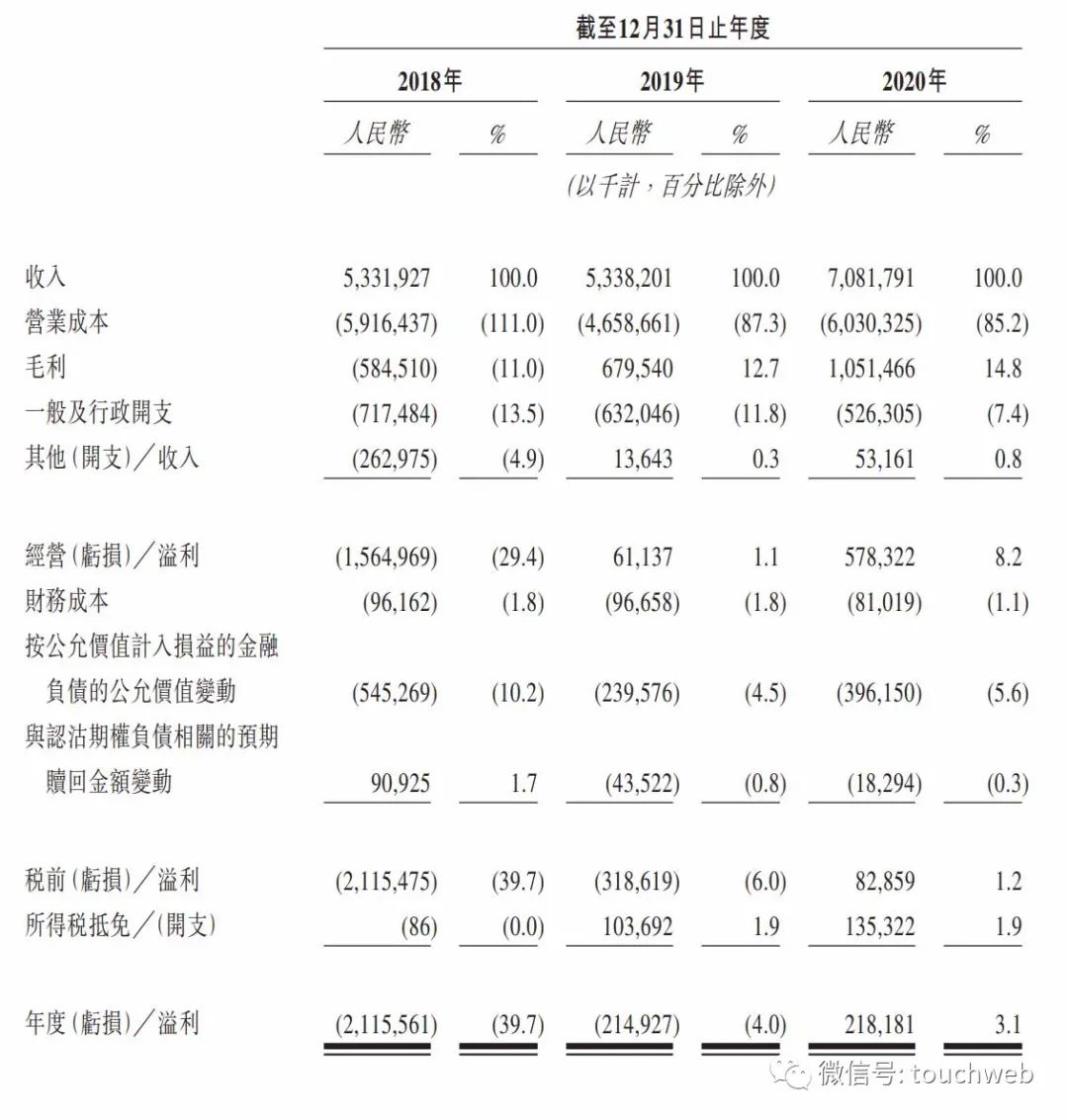 招股书显示,安能物流2018年、2019年、2020年营收分别为53.32亿元、53.38亿元、70.82亿元;毛利分别为-5.85亿元、6.8亿元、10.5亿元,毛利率分别为-11%、12.7%、14.8%。