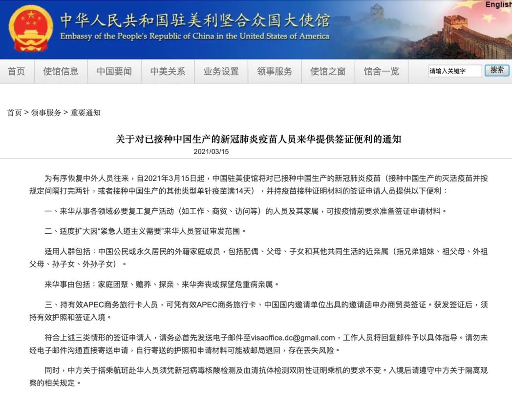 今年3月,外交部发言人在例行记者会上表示:“自2021年3月15日起,中方对已接种中国生产的新冠肺炎疫苗,并持疫苗接种证明材料的外籍人员提供来华签证便利。”