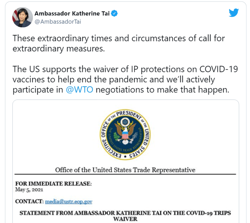 另外,5月6日消息,美国政府表示支持有限期地放弃新冠疫苗专利权,欧盟、中国对此持开放态度(但德国等反对),这可能会推进国际疫苗在中国的上市进程,不过协议程序繁琐,不知要等到何时。