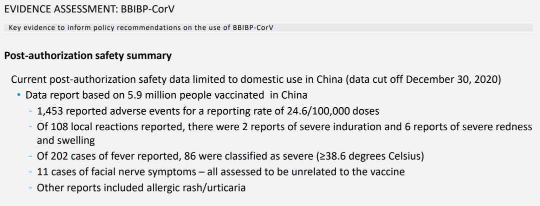 国药北生所疫苗,在中国590万剂接种数据,报告1453例不良反应,包括局部硬结(2例严重)、局部发红肿胀(6例严重)、发烧(86例严重)、面部神经症状(11例)、过敏性皮疹/荨麻疹。