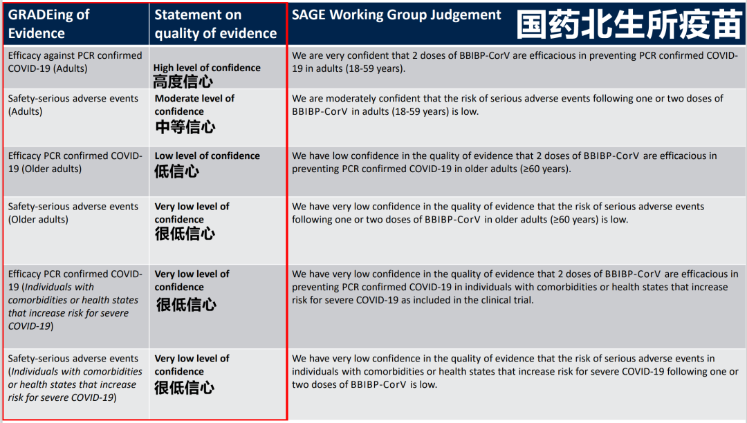 需要注意的是,低信心并不是说存在问题,无论是老人还是有合并症人群,临床试验都没有出现严重不良反应。但是面向这些人群的临床试验数据太少,所以WHO对于得出“防护有效”或“无副作用”的结论信心不足。