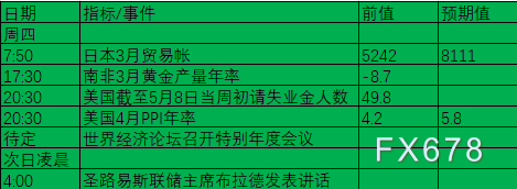 5月10日-5月16日当周,美国方面将公布一系列重要的数据,包括4月CPI、PPI、零售销售、初请、EIA库存等,欧洲方面将公布经济景气指数及投资者信心指数,另外还有英国GDP及中国CPI数据出炉。原油市场还将有欧佩克月度报告及EIA能源展望报告。除此之外,美联储官员及英国央行行长贝利都将出来讲话。