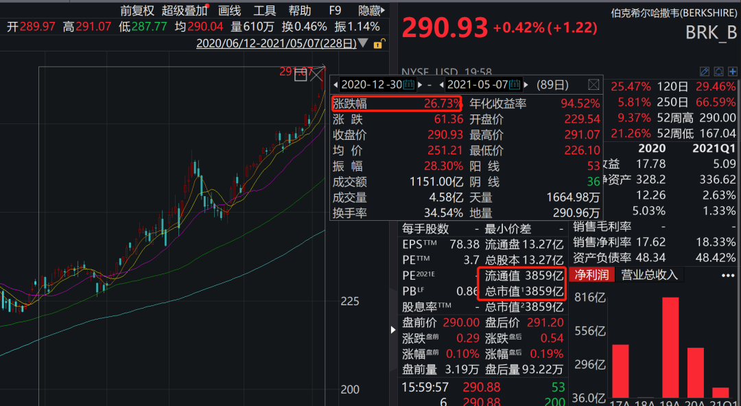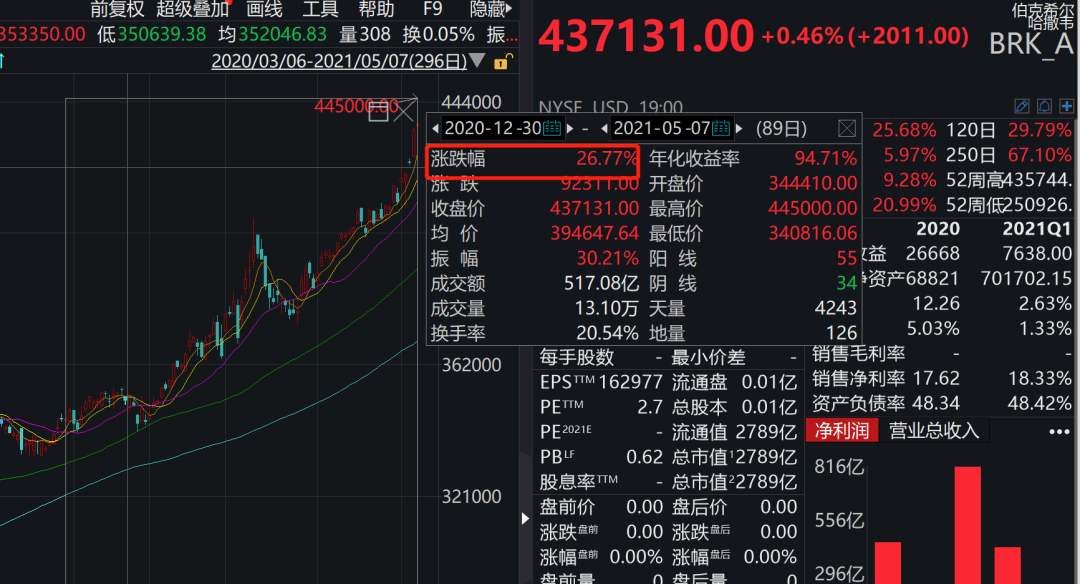 Wind数据显示,今年以来,伯克希尔 ·哈撒韦A类股票从34万暴涨至最新的43.7万,市值暴涨590亿美元(近3800亿元人民币)至2789亿美元。