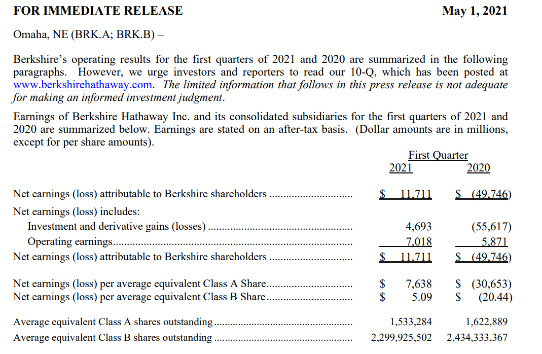 根据当时 伯克希尔哈撒韦 发布一季度财报显示,2021年第一季度营收645.99亿美元,前值为612.65亿美元,预期为635.39亿美元。公司当季运营利润70.2亿美元,较去年同期增长20%,比疫情暴发前、也就是2019年的55.6亿美元高出了26%以上。