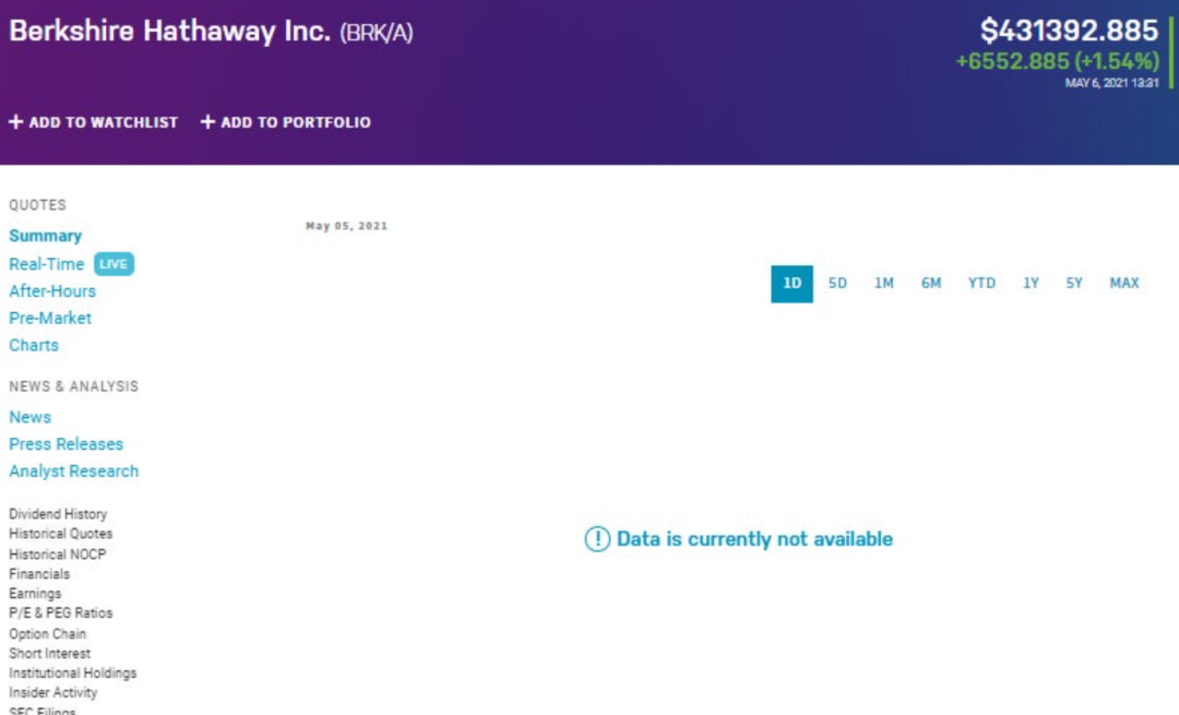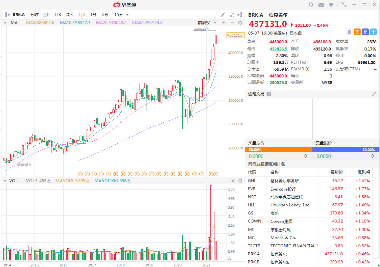 而最新数据显示,截至5月7日,伯克希尔哈撒韦A类股股票的价格为43.7131万美元一股,这意味着,买一股需要人民币281万元,并且还呈上升趋势……这个消息虽然鼓舞了投资者的士气,但却给纳斯达克的系统带来了隐患。