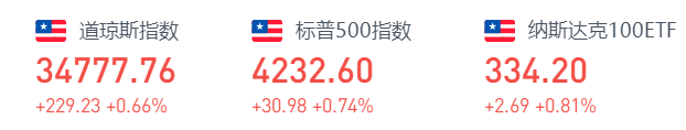 上周五收盘,道琼斯指数涨229.23点,涨幅0.66%,报34777.76点;标普500指数涨30.98点,涨幅0.74%,报4232.6点;纳斯达克综合指数涨119.40点,涨幅0.88%,报13752.24点。道琼斯上周涨2.67%,报34777;纳斯达克上周跌1.50%,报13752;标普500上周涨1.22%,报4232。