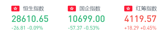上周五收盘,恒生指数跌26.81点或0.09%,报28610.65点。国企指数跌0.53%,报10699.00点,红筹指数涨0.45%,报4119.57点。恒生指数上周跌0.40%,报28610;恒生科技指数上周涨4.31%,报7954;国企指数上周跌1.17%,报10699。