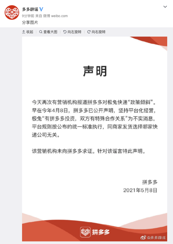 5月8日晚,拼多多在其官方辟谣平台发布声明称,今天再次有营销机构报道拼多多对极兔快递“政策倾斜”。早在今年4月8日,拼多多已公开声明,坚持平台化经营,极兔“有拼多多投资,双方有特殊合作关系”为不实消息,平台规则按公布的统一标准执行,同商家发货选择哪家快递公司无关。该营销机构未向拼多多求证。针对该谣言特此声明。