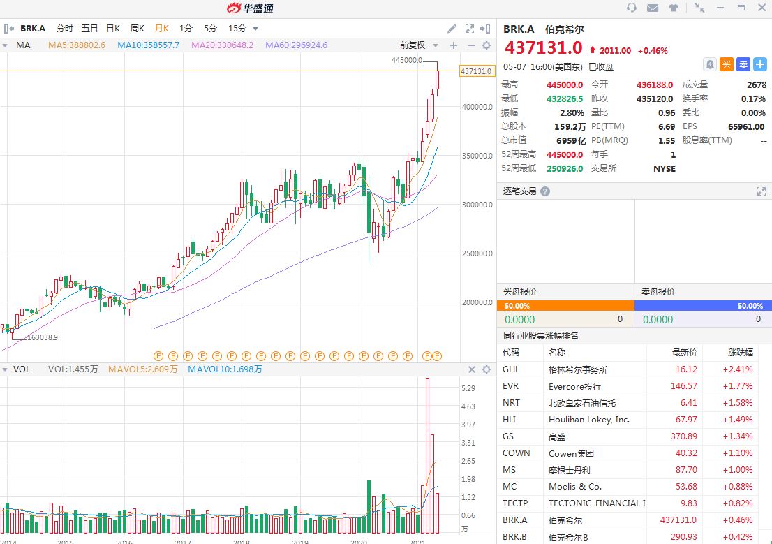 一季度向好财报表现向好叠加股东大会召开,伯克希尔·哈撒韦公司A类股和B类股股价上周股价双双大涨逾5%。目前,伯克希尔·哈撒韦公司A股股价为437131美元,B股股价为290.93美元。由于伯克希尔·哈撒韦A类股股价过高,纳斯达克交易所电脑系统已经无法记录这一价格。纳斯达克交易所从本周二开始暂停播报伯克希尔·哈撒韦A类股票的价格。