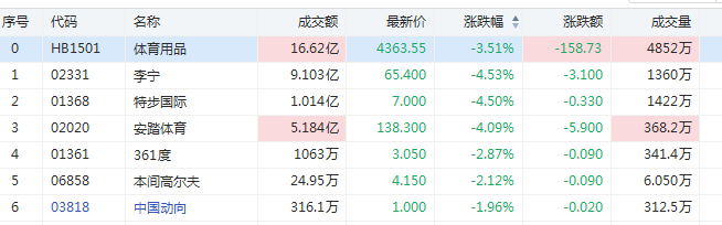 港股体育板块走低,李宁、特步国际、安踏体育跌逾4%,361度、中国动向等跟跌。