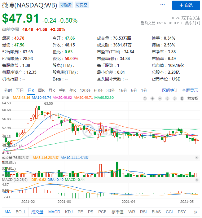 截至发稿时间,微博股价盘前上涨3.30%,报49.49美元。