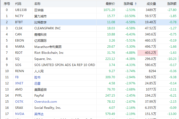 华盛资讯5月10日消息,美股早盘,区块链板块普跌,第九城市(NCTY)跌近11%,比特数字(BTBT)跌近7%,嘉楠科技(CAN)跌超6%,Marathon Patent(MARA)跌超5%,Riot Blockchain(RIOT)跌近5%。