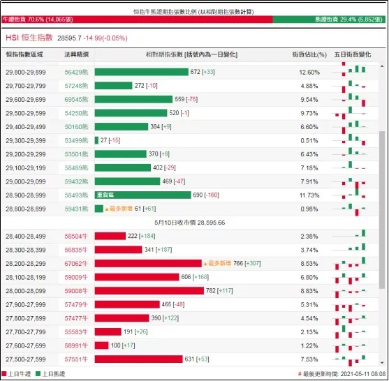 街货分布方面,至周一,恒指牛证街货在收回价28000点至28500点之间,累计相当约2717张期指合约;恒指熊证街货在收回价28800点至29300点之间,累计相当约1992张期指合约。
