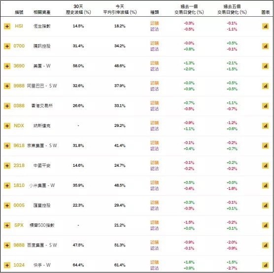 周一恒指相关权证的平均引伸波幅报约18.2%。个股方面,美团、快手相关认购证的引申波幅小幅上升,美团、纳斯达克相关认沽证的引申波幅有所下降。