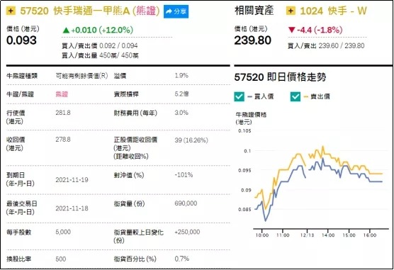 1、强势轮证:快手瑞通一甲熊(57520.HK),周一上涨12%;