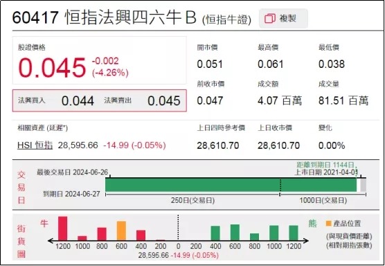2、看错方向:恒指法兴四六牛(60417.HK),周一小幅下跌4.26%。