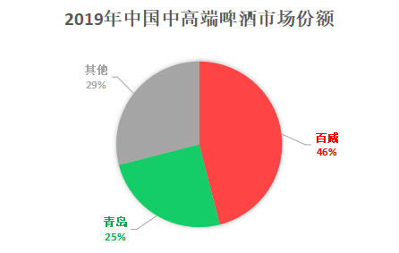 在中国啤酒市场,百威在中高端领域处于垄断地位。百威旗下的全球旗舰和全国性品牌:百威、科罗娜、哈尔滨和雪津啤酒常年占据着销量榜前列位置。2019年,百威占据了中国高端啤酒市场份额高达46%。