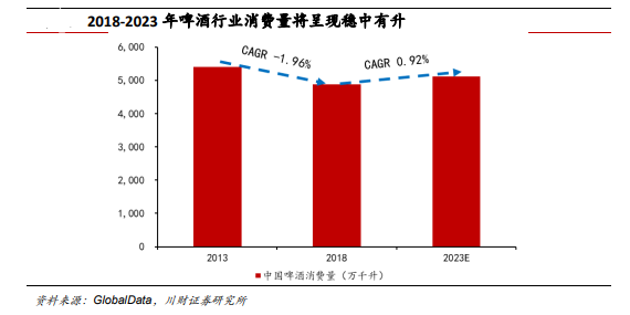 事实上,瞄准烈酒和功能饮料一方面是百威完善产品布局,另一方面则是为了寻找新的业绩增长点。在中国啤酒市场,需求端基本上处于天花板的位置,自2013年消费量触顶之后均处于下滑状态,增长空间并不大。川财证券预计,未来5年中国啤酒市场的CAGR(复合年平均增长率)约为0.92%,仅有望小升。