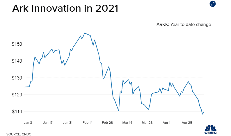 “牛市女皇”CathieWood旗下旗舰基金ARKK创下年内新低,较近期高点下跌近35%。这只专注投资于旨在颠覆行业的科技公司的ETF周一下跌5.2%,是纳斯达克100指数跌幅的两倍,目前该指数已较2月份的峰值下跌逾30%。