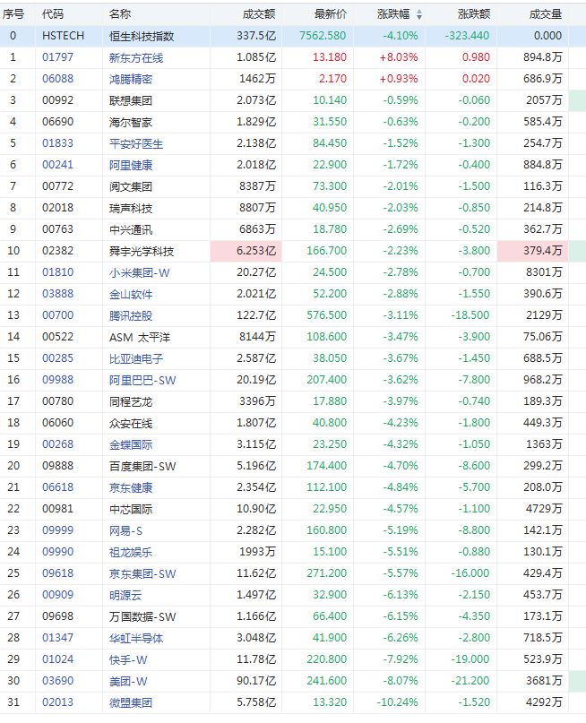 微盟集团跌10%;快手-W跌超7%。京东集团-SW、网易-S跌超5%。中芯国际、百度集团-SW跌超4%。