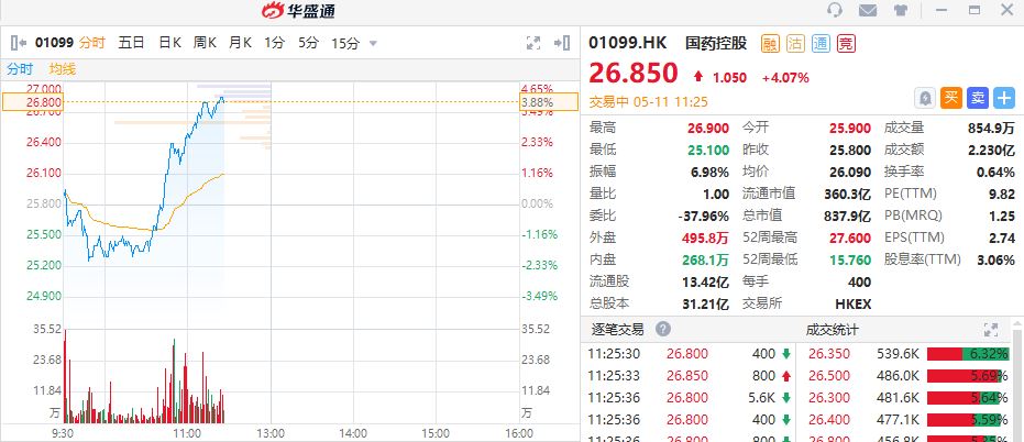 华盛资讯5月11日消息,当地时间10日,世卫组织举行新冠肺炎例行发布会,世卫组织助理总干事玛丽安热拉·西芒表示,世卫组织评估了中国国药新冠疫苗的临床数据,认可了该疫苗的有效性和安全性。受此消息驱动,国药控股早盘逆市上涨,截止发稿,国药控股涨超4%,现报每股26.85港元,总市值837.9亿港元。