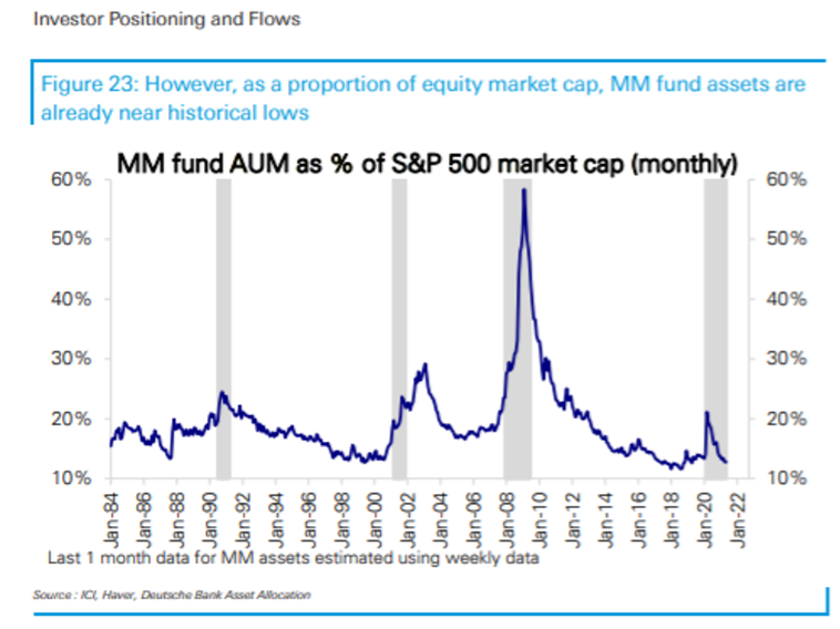 另外,大量现金在一旁观望。根据德意志银行的报告,货币市场基金中的现金在去年疫情期间增加了超过1万亿美元。但报告显示,尽管货币市场基金资产处于4.5万亿美元左右的历史高位,但若以占股市价值的比例衡量,则接近历史低点。