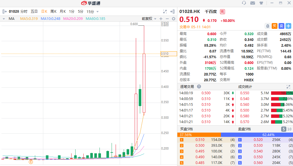 华盛资讯5月11日,千百度午后再度刷新52周新高,现大涨50%,报0.51港元每股,成交额达2452万港元,换手率为2.4%。该股本月曾一度暴涨超200%。