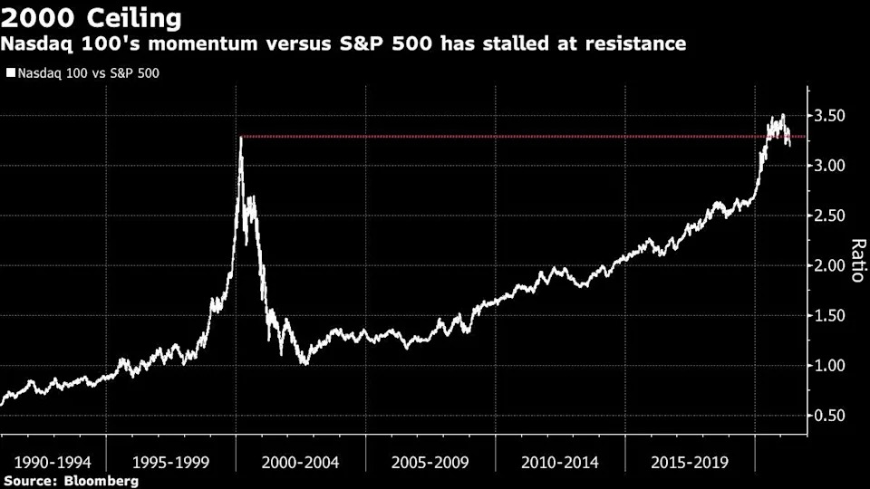 将纳斯达克的相对高度与标准普尔500指数作图,可以看出该比率再次回落至其2000年的峰值以下。DoubleLine Capital LP创始人Jeffrey Gundlach认为,3月份未能保持在该阻力之上的证据表示,可能还会有另一场崩盘。